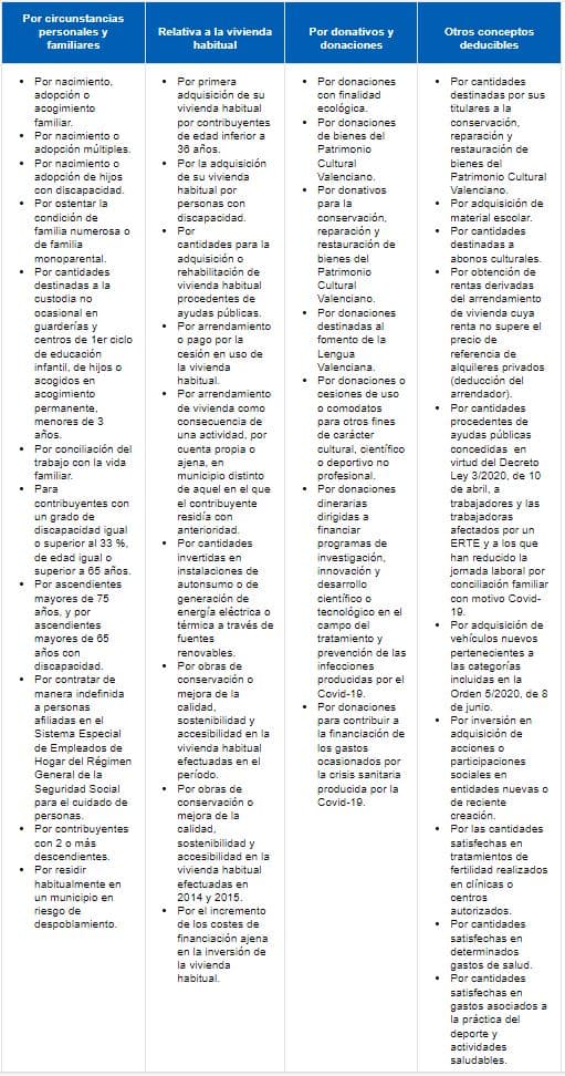 Tabla de deducciones más relevantes en la Comunidad Valenciana 2023