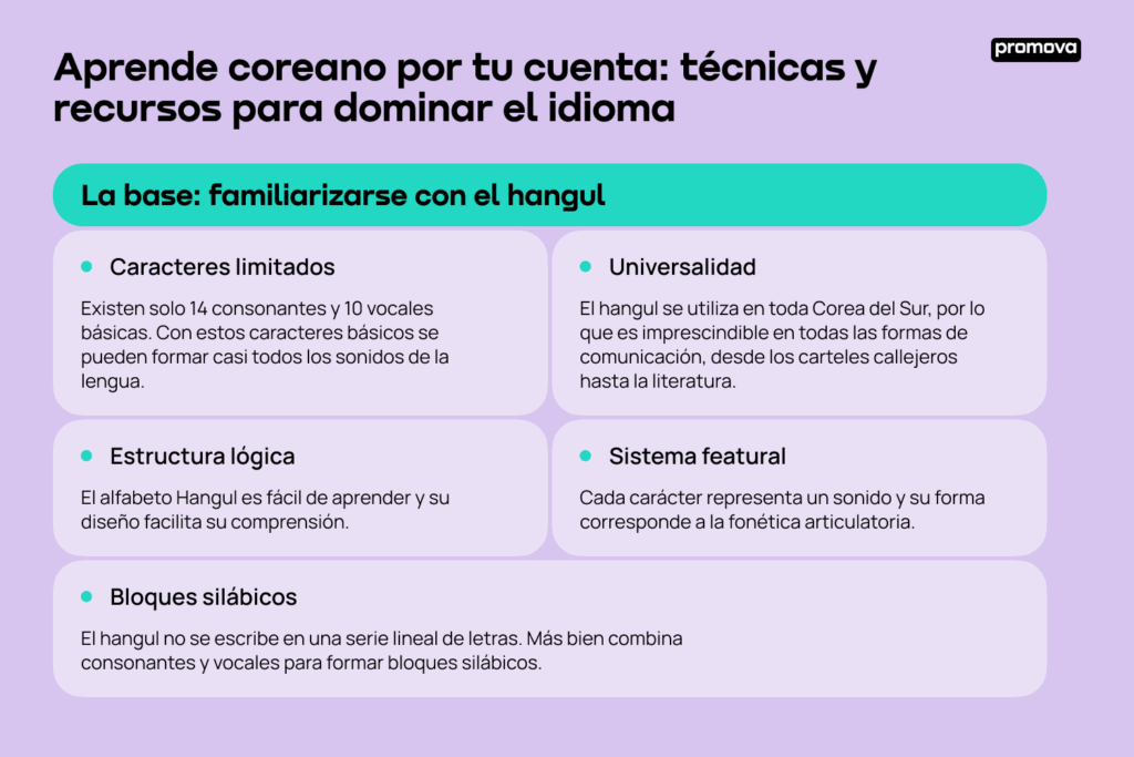 Dominar el Hangeul, el alfabeto coreano, es el primer paso crucial para aprender el idioma de manera efectiva. A diferencia de los sistemas de escritura basados en caracteres como el chino o el japonés, el Hangeul es un alfabeto fonético, lo que significa que cada símbolo representa un sonido específico. Fue creado en el siglo XV por el rey Sejong el Grande con el objetivo de facilitar la alfabetización de la población coreana. El Hangeul consta de 14 consonantes y 10 vocales básicas, que se combinan para formar sílabas. Aprender a leer y escribir en Hangeul te permitirá acceder a una gran cantidad de recursos de aprendizaje en coreano, como libros, artículos y sitios web. Además, te ayudará a mejorar tu pronunciación y comprensión auditiva, ya que podrás asociar los sonidos a los símbolos correspondientes. Dedica tiempo a practicar la lectura y escritura del Hangeul hasta que te sientas cómodo con él, ya que esto sentará una base sólida para tu aprendizaje del idioma.